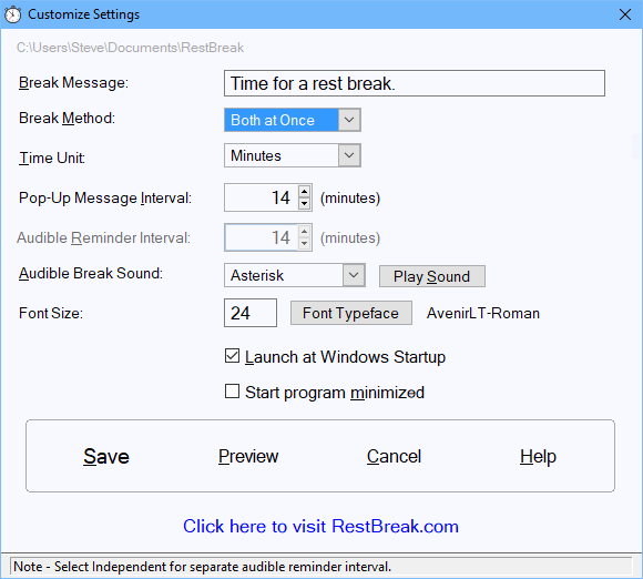 This pop-up message box reminds you to take a break or whatever message you specify.